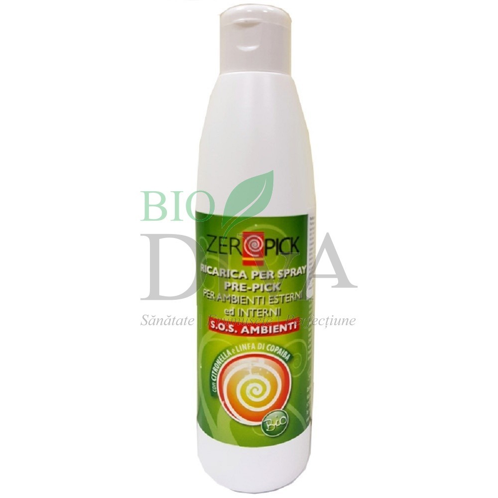 Refill pentru Sprayul ambiental BIO împotriva țânțarilor ZEROPICK cu un parfum natural delicat, bazat pe ulei esențial organic de lemongrass și copaiba, purifică și parfumează aerul din încăperi, dar și din jurul nostru când suntem afară. Aromă uleiurilor esențiale ține la distanță țânțarii și insectele supărătoare, atât în interiorul cât și în exteriorul casei, atunci când suntem la terasă sau în grădina. Este complet natural și sigur pentru copii și animale, nu conține ingrediente toxice și este certificat bio AIAB.