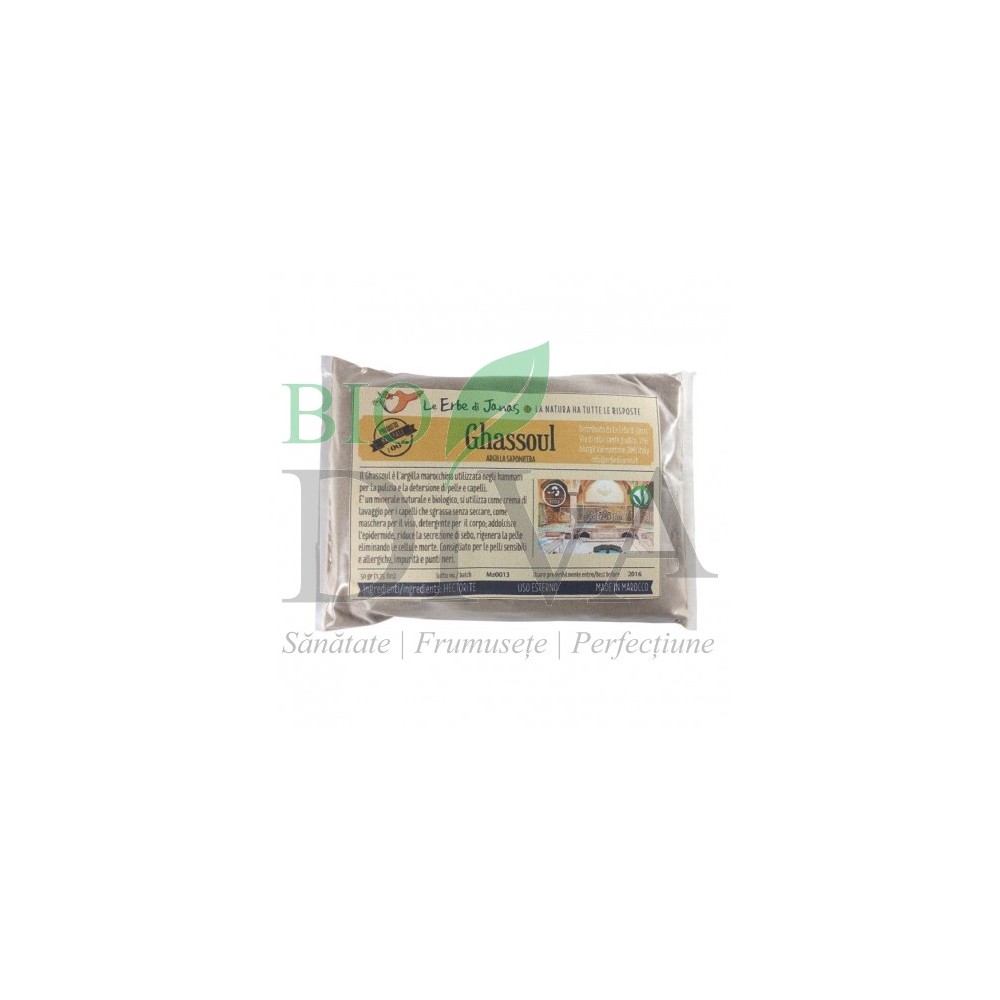 Argila Ghassoul Le erbe di Janas este 100% naturala, unica in lume, contine saponine si este ideala pentru ingrijirea tenul gras, acneic si a parului gras. Argila Ghassoul, cunoscuta si sub denumirea de rhassoul, este o argila marocana, unica in lume,ᅠformata din 100% minerale. Spre deosebire de alte tipuri de argila, pudra de ghassoul contine saponine, femeile berbere din Maroc o folosesc de mii de ani pentru spalarea pielii si a parului.