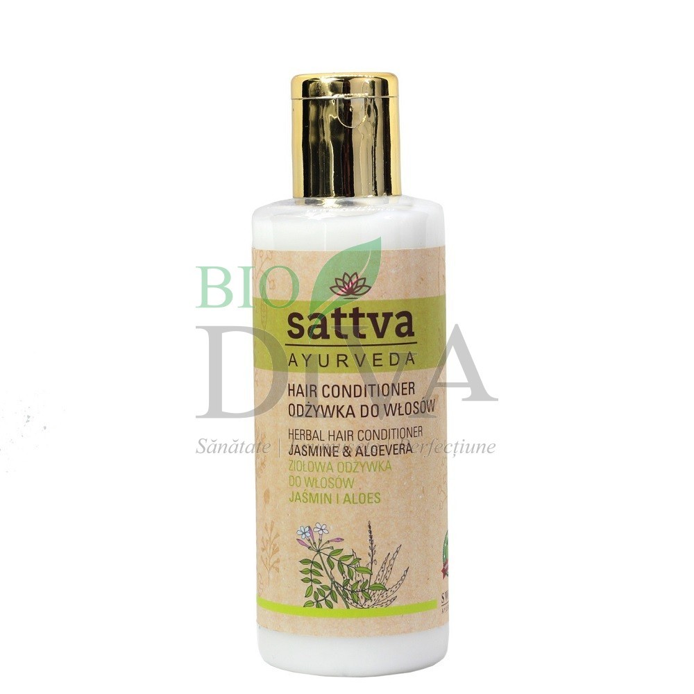 Balsamul de păr ayurvedic cu iasomie și aloe Sattva Ayurveda este recomandat pentru toate tipurile de păr. Conține iasomie, aloe și proteine care hidratează părul. Creează o peliculă în jurul firului de păr, care reflectă lumina și face părul mai strălucitor.