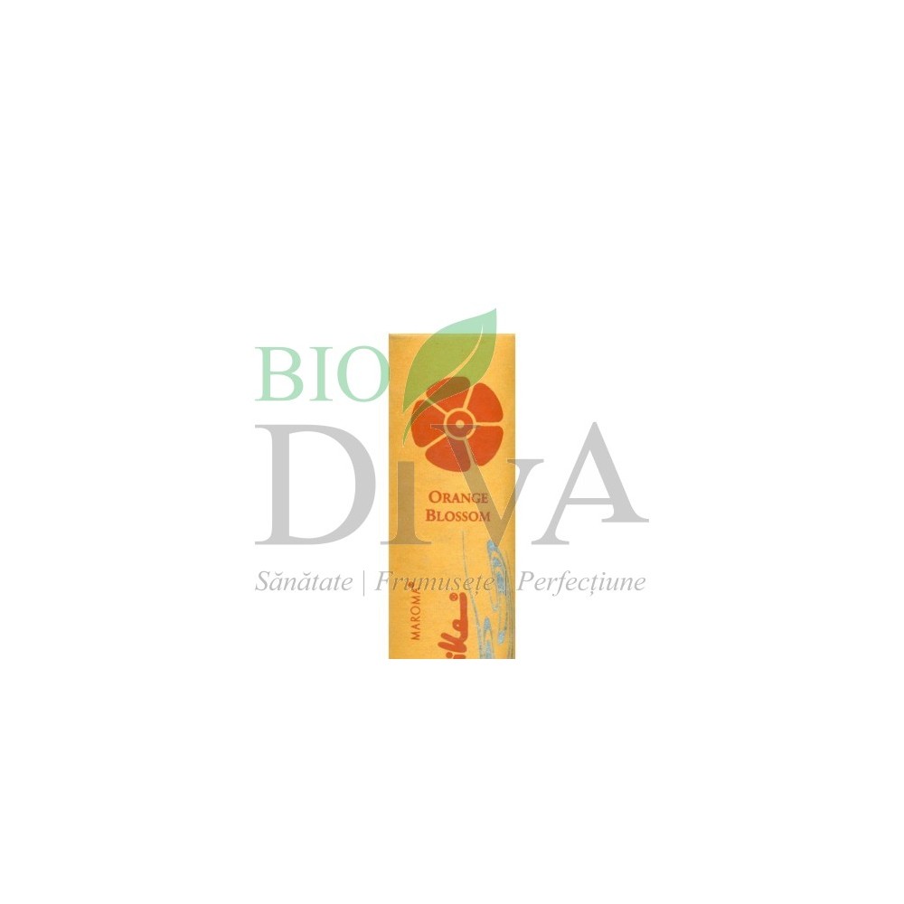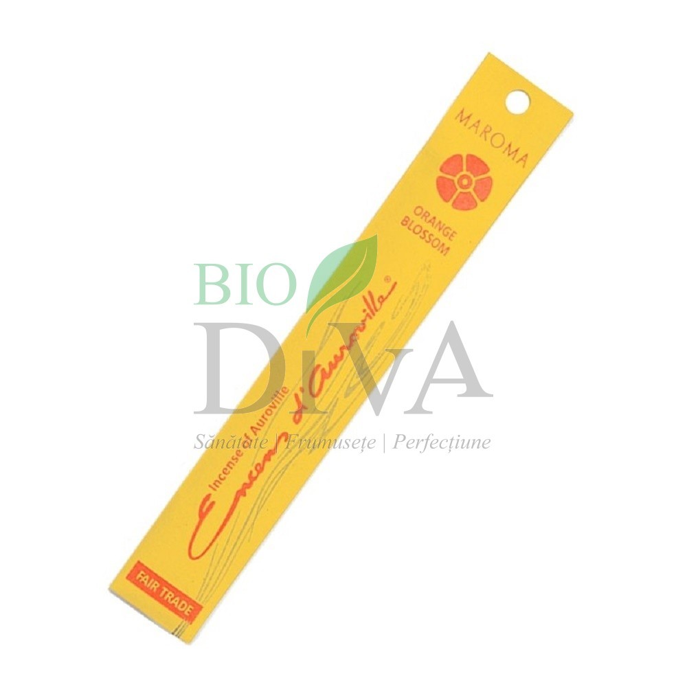 Betisoare parfumate bio cu flori de portocal (Orange Blossom) cu uleiuri esentiale 100% naturale din gama Maroma elimina mirosurile, confera un parfum proaspat ce stimuleaza si ofera o stare de pozitivism. Betisoarele sunt realizate manual din lemn de bambus netratat chimic, praf de lemn, rasina vegetala naturala si uleiuri esentiale 100% naturale. In timpul arderii degaja o aroma persistenta, naturala, data de uleiurile esentiale de petitgrain, portocale si absolut de iasomie. Fabricat in India. Betisoarele parfumate Maroma sunt produse in India din ingrediente naturale de cea mai buna calitate de o cooperativa Fair Trade (comert echitabil) din Auroville, India.
