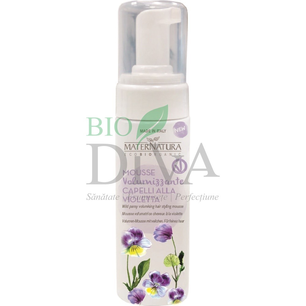 Spuma de păr pentru volum cu violete marca Maternatura conferă volum și fermitate buclelor și onduleurilor, conferă un surplus de strălucire, și permite crearea de bucle în cazul în care părul este drept. Spuma de coafare Maternatura rezistă în condiții de umiditate, are o formulă care nu este lipicioasă, oferă o senzație plăcută la atingerea părului. Spuma de păr cu violete Maternatura conferă volum tuturor tipurilor de păr, definește buclele și le conferă fermitate. Este un produs care o textură aerată, light, care nu încarcă părul. Se poate folosi și pentru coafarea buclelor în cazul în care părul este drept. Nu usucă, nu este lipicioasă și lasă părul ușor de pieptănat. Conține un polimer de origine vegetală care modelează buclele și le conferă fermitate, aminoacizi din soia, din grâu și peptide din ovăz care învelesc firele de păr conferindu-le astfel volum. Spuma este ideală pentru părul ondulat, părul creț deoarece conferă fermitate buclelor părul drept dacă se dorește coafarea de bucle cu ajutorul uscătorului sau a periei.