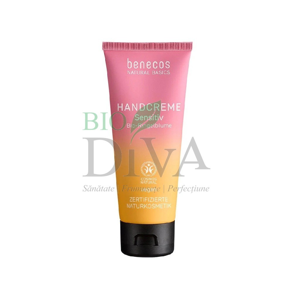 Crema de mâini Sensitiv cu gălbenele Benecos perfectă pentru piele sensibilă, conține ingrediente naturale, având rolul de a oferi pielii mâinilor o îngrijire optimă. Aceasta are o formulă lejeră ce se absoarbe rapid, lăsând pielea hidratată, catifelată și plăcută la atingere. Crema are la bază extracte din plante atent selecționate: gălbenele, aloe vera cât și ulei din sâmburi de struguri. De asemenea, produsul este și vegan.