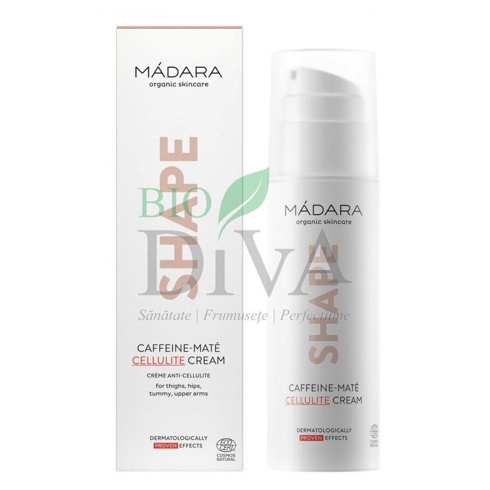 Crema anticelulită Shape Caffeine Mate Madara hidratează și tonifică pielea dându-i un aspect mai ferm și mai fin. Îmbogățită cu cofeină stimulatoare și cu extracte de castan, spirulină și ceai maté, formula are un efect puternic, activând circulația în zona șoldurilor, coapselor, burții și brațelor. Textura mătăsoasă, ușor de aplicat, învăluie pielea cu o senzație de hidratare bogată și confort durabil.