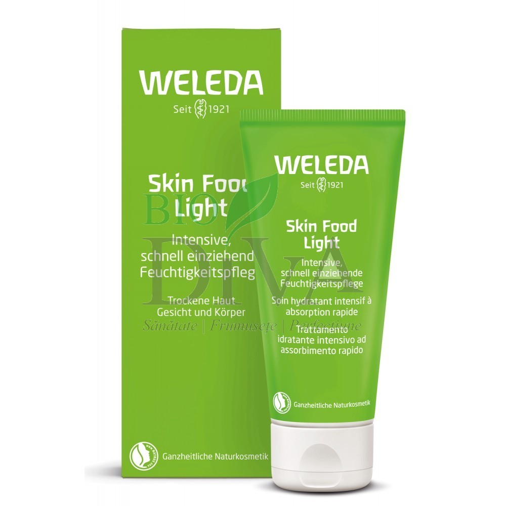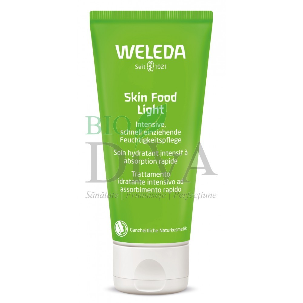 Crema nutritivă Skin Food Light marca Weleda oferă hidratare imediată tenului și corpului. Formula delicată pe bază de extracte vegetale intră rapid în piele. Mixul de mușețel, gălbenele și panseluțe revigorează simțurile și oferă pielii uscate o doză bună de hidratare. Aceasta se va simți fină la atingere și regenerată. Oferă îngrijire intensivă pentru ten și corp și este ideală pentru pielea uscată. Are o textură ușoară care se absoarbe rapid în piele.