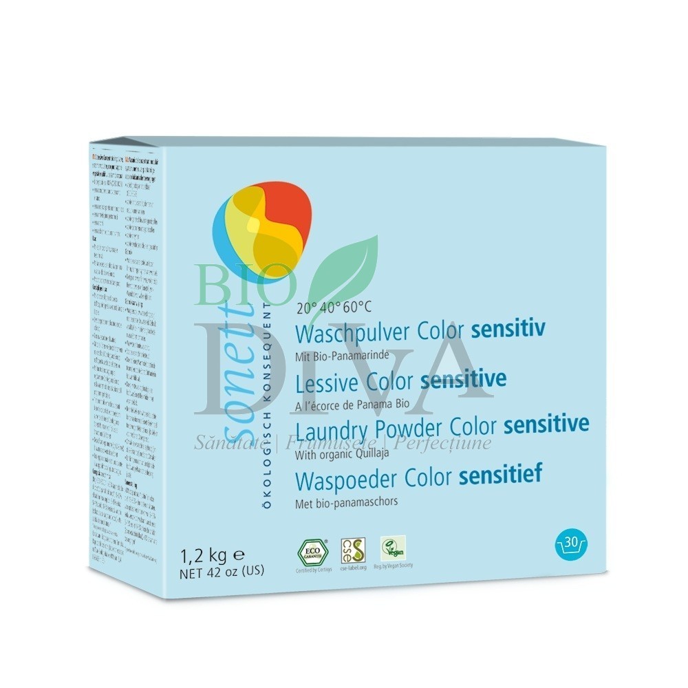 Detergentul bio ecologic praf pentru rufe din gama Sonett este potrivit pentru haine din bumbac, in, cânepă, și mixturi de țesături, îndepărtează petele și igienizeaza, lasă rufele curate și catifelate la atingere. Ingredientul principal al acestui detergent este săpunul vegetal pur. Spală la temperaturi cuprinse între 40 și 95 °C. Nu se recomandă pentru lână, mătase, și microfibre. Se poate utiliza în mașina de spălat. Pentru un detergent pe bază de săpun vegetal, un nivel scăzut al durității apei este obligatoriu pentru rezultate bune. Biodegradabilitate: datorită faptului că ingredientele detergentului sunt din plante, microorganismele pot descompune rapid ingredientele în procent de 100%. Sistemul modular conceput de Sonett cu dozarea separată a celor 3 componente principale dintr-un proces de spălare, și anume: substanțele active de spălare (detergentul propriu zis); dedurizantul; complexul de substanțe pentru oxigenare (înălbire). Acest sistem modular permite folosirea optimă a fiecărei substanțe în concordanță cu nivelul de murdărire a rufelor, nivelul durității apei, și nivelul dorit de înălbire. Datorită sistemului modular, putem folosi detergentul chiar și în apa dură, alegând dozarea corespunzătoare a detergentului și a dedurizantului conform indicațiilor de dozare din tabelul de mai sus (de exemplu, dacă apa are o duritate mare, atunci conform sistemului modular, vom folosi pentru rufe puțin murdare 50ml de detergent și 60ml de dedurizant).