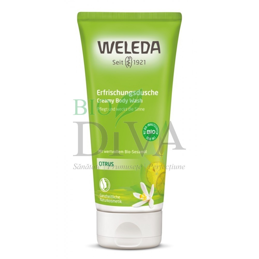 Loțiunea de duș cu citrice,marca Weleda învigorează corpul și spiritul, iar pielea este curățată cu blândețe. Aroma proaspătă a lămâilor și portocalelor bio conferă energie și revigorează pielea. Începeți ziua cu o porție de prospețime! Conține ulei pur de susan, bogat în acizi grași nesaturați, care menține umiditatea proprie a pielii și în același timp previne deshidratarea. Astfel pielea se simte fină și moale după duș.