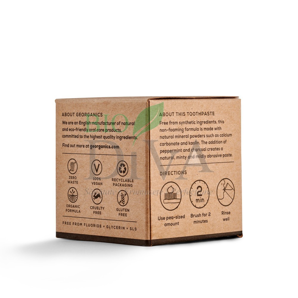 Pasta de dinți minerală în borcănel de sticlă marca Georganics are un conținut de cărbune activ și poartă o aromă proaspătă de mentă, provenind din uleiul esențial organic al plantei aromatice. Dincolo de gust și parfum, studii relevante au indicat faptul că uleiul de mentă este deosebit de eficient în neutralizarea bacteriilor anaerobe, bacterii care pot determina afecțiuni ale gingiei. Formula să fără peroxid este un substitut ideal pentru pastele de dinți cu efect de albire convenționale. Îndepărtează petele de la suprafața dintelui în mod natural, fără o acțiune dură, abrazivă, asupra smalțului. Cărbunele activ din compoziție are un puternic efect de albire a dinților. Formulă fără fluor și SLS este un substitut ideal pentru pastele de dinți tradiționale. Borcănelul pentru o persoană ajunge până la 4 săptămâni, raportat la un periaj zilnic de 2 ori pe zi.