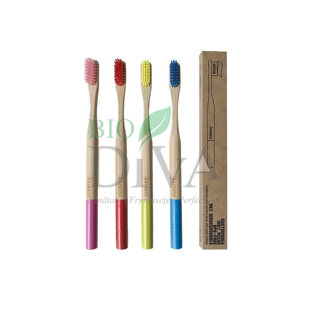 Periuța de dinți cu mâner din lemn de bambus și peri din nailon cu duritate medie (Medium) este o alternativă ecologică. Respectă natura fiind o periuță ecologică, 96% biodegradabilă, 100% vegan și BPA-free. Bambusul este o resursă naturală 100% regenerabilă, durabilă și ecologică. Periuțele sunt disponibile în 4 culori: roz, roșu, blu și galben. Perii periuțelor sunt albi. Cutia este din carton reciclat.