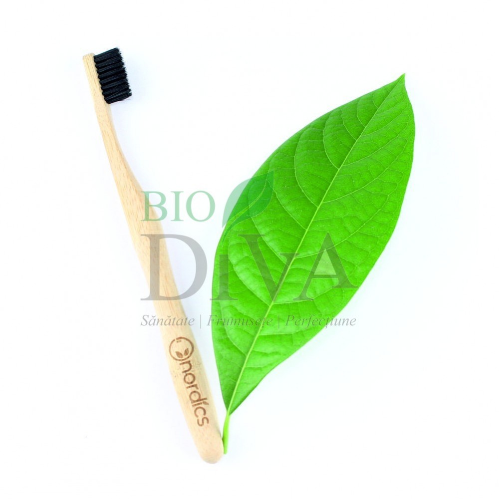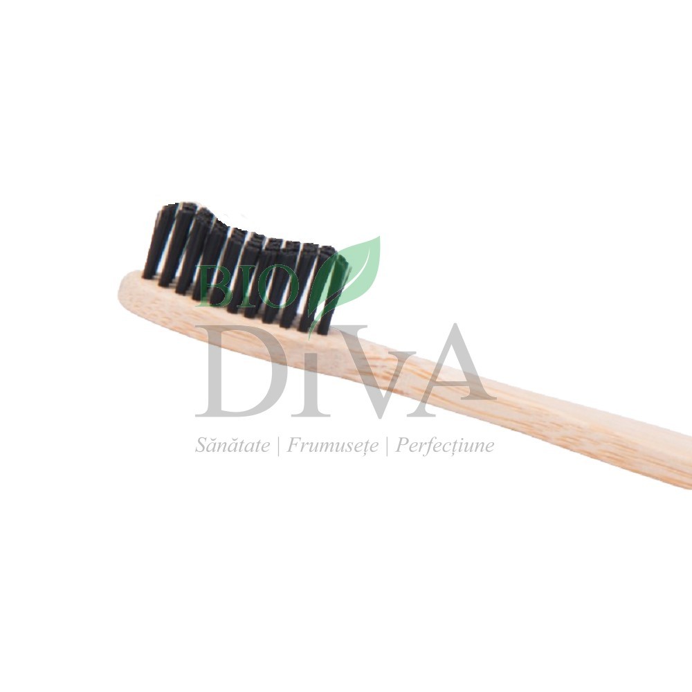 Periuța de dinți din bambus cucărbune activ Irisanaare peri ce sunt tratați cu cărbune activ pentru a ajuta la albirea dinților, fără agenți chimici, coloranți și fără a afecta sănătatea generală a smalțului. Capacitatea purificatoare a cărbunelui activ face ca această periuță de dinți să fie eficientă. Confortabilă și durabilă, periuța de dinți este realizată din bambus ce nu afectează mediul. Bambusul special tratat este un material rezisten la apă și mai ales este igienizant, Perii sunt fabricați din nailon și tratați cu cărbune activ pentru un efect de albire a dinților.
