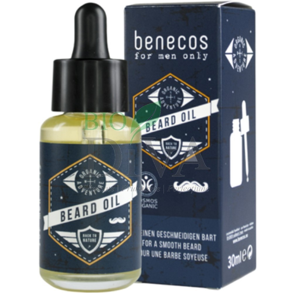 Uleiul organic pentru barbă marca Benecos menține suplețea pielii și netezimea bărbii. Se absoarbe rapid și conține uleiuri prețioase 100% naturale certificate organic. Uleiurile prețioase sunt obținute din argan, migdale și floarea soarelui, care hidratează pielea și barbă, lăsând-o moale și mătăsoasă. Produsul este vegan.
