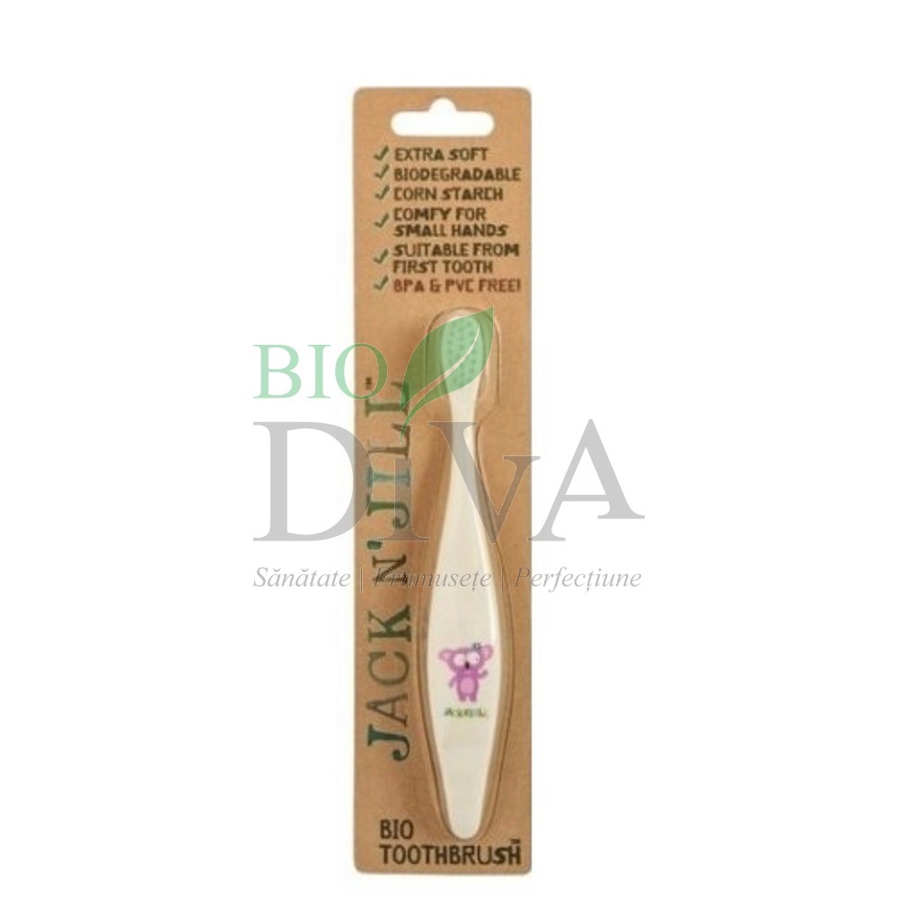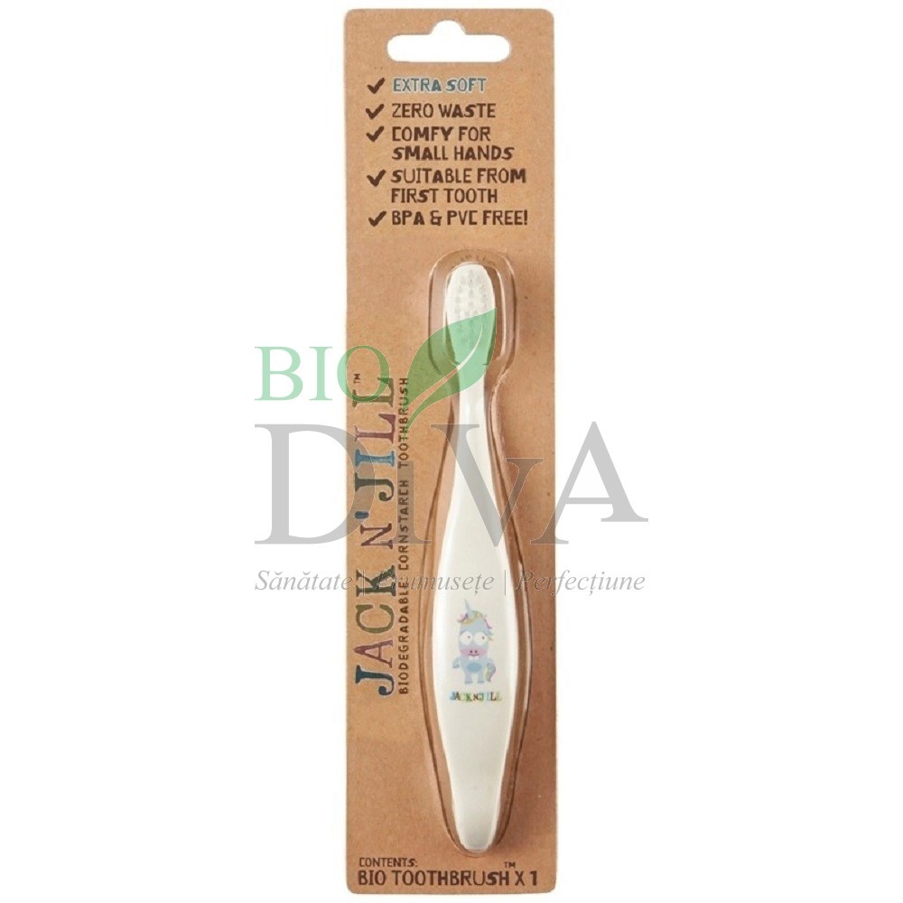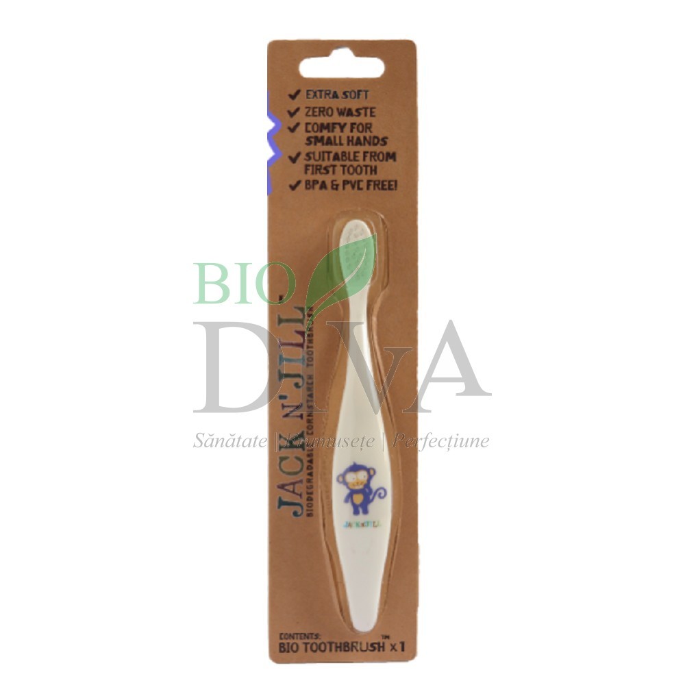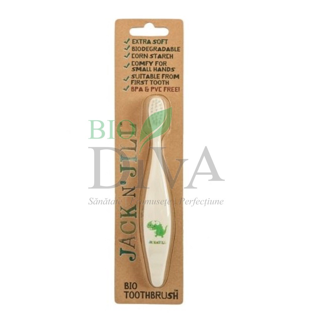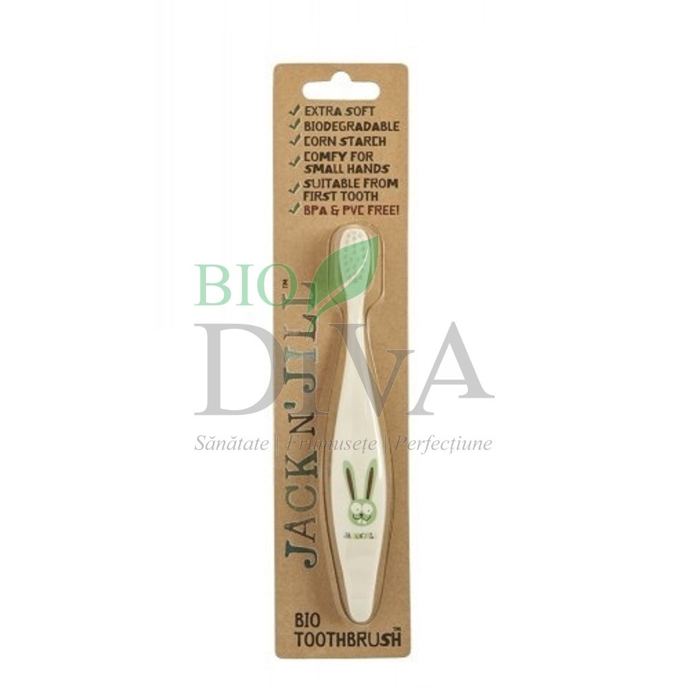 Periuța de dinți pentru copii cu mâner ergonomic Jack N'Jill este biodegradabilă și reciclabilă. În numai 90 de zile se poate transforma în compost. Perii sunt din nylon rotunjit pentru o curățare excelentă.