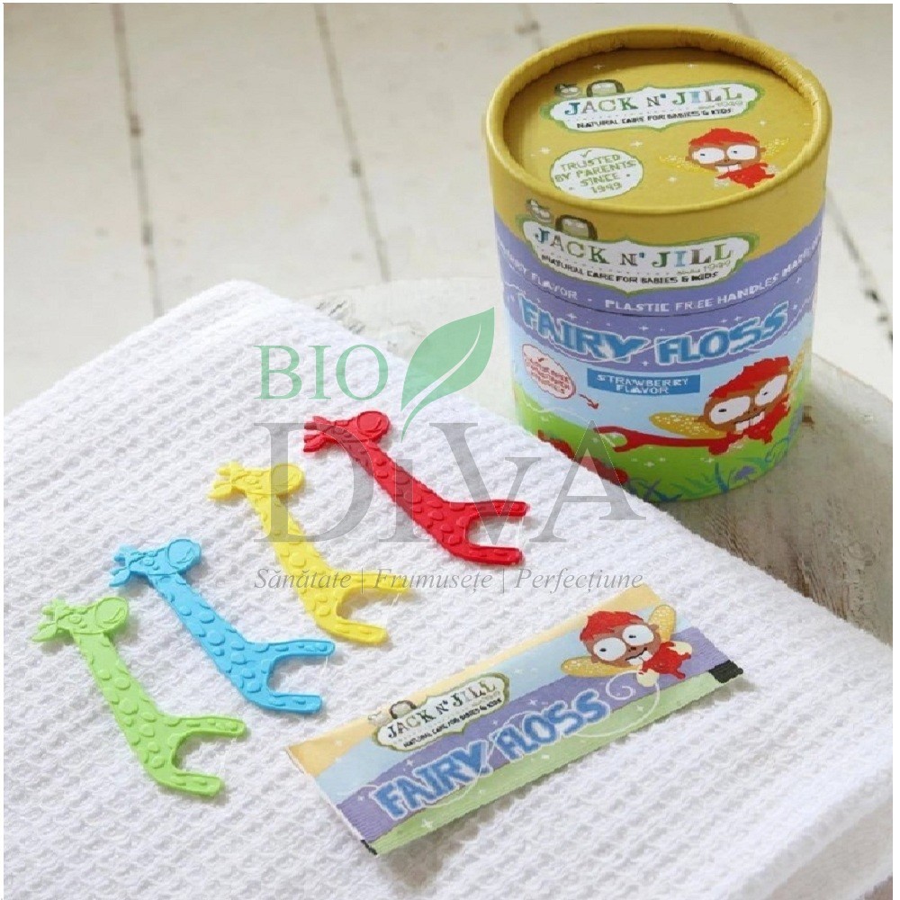 Ața dentară pentru copii cu scobitori biodegradabile Jack n' Jill este făcută din amidon de porumb, Fără chimicale și cu o aromă naturală de căpșuni, ața alunecă ușor printre dinți pentru a scoate resturile alimentare fără BPA, PVC, plastic, ftalati zero waste.