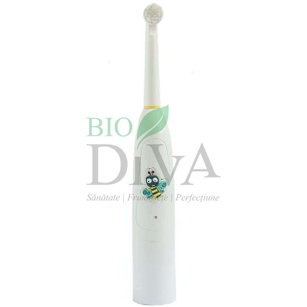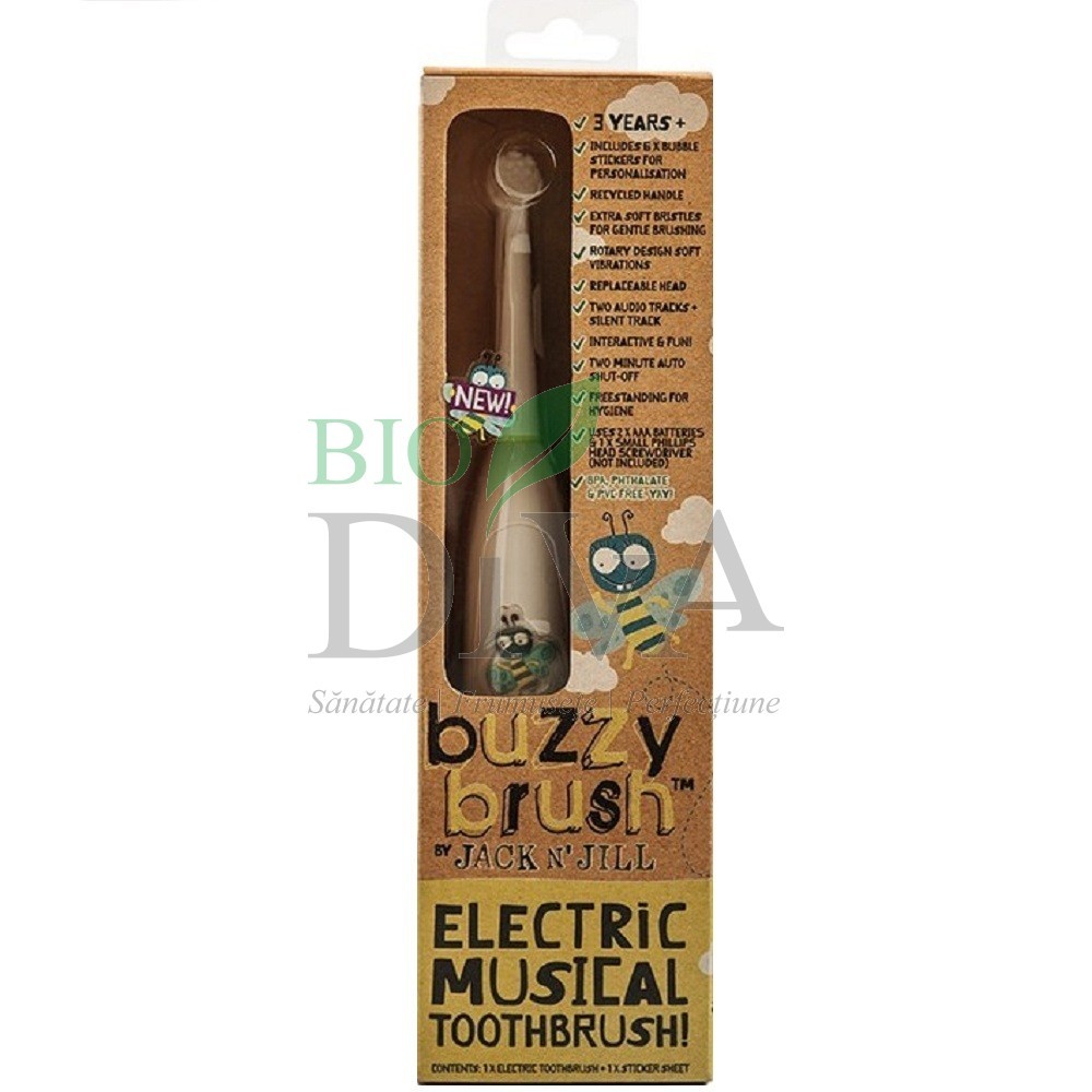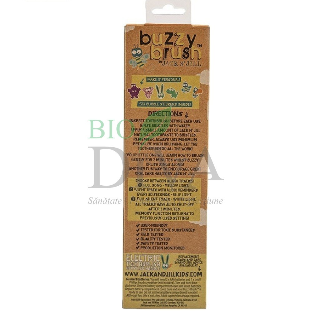 Periuța de dinți electrică recomandată pentru copii Buzzy Brush Jack n' Jill este fabricată din materiale non toxice și reciclabile, cu un design jucăuș și o melodie plină de veselie. Buzzy Brush vine însoțită de 6 stickere amuzante. Ajutați-l pe cel mic să-și aleagă stickerul favorit (sau mai multe), dezlipiți fără să atingeți partea adezivă și presați cu putere pe mânerul periutei. Nu încercați să dezlipiți de pe periuță, stickerul nu se va putea reutiliza. Nu permiteți copilului să bage stickerele în gură.
