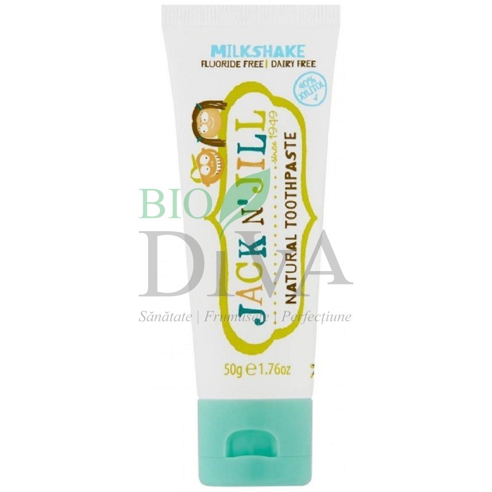 Pasta de dinți naturală pentru copii de la Jack N' Jill conține aromă organică de milkshake. Poate fi folosită de copii peste 6 luni. Pasta de dinti Jack N'Jill este 100% sigură pentru copii, mai ales că aceștia au tendinta să o înghită! Toate ambalajele sunt concepute a fi atrăgătoare pentru copii. Toate pastele de dinti sunt naturale, hipoalergene si cu ingrediente organice. Toate aromele sunt naturale si certificate USDA Organic (United States Department of Agriculture). Pastele au grad alimentar, sunt certificate Vegan, Gluten Free, si nu contin alergeni.