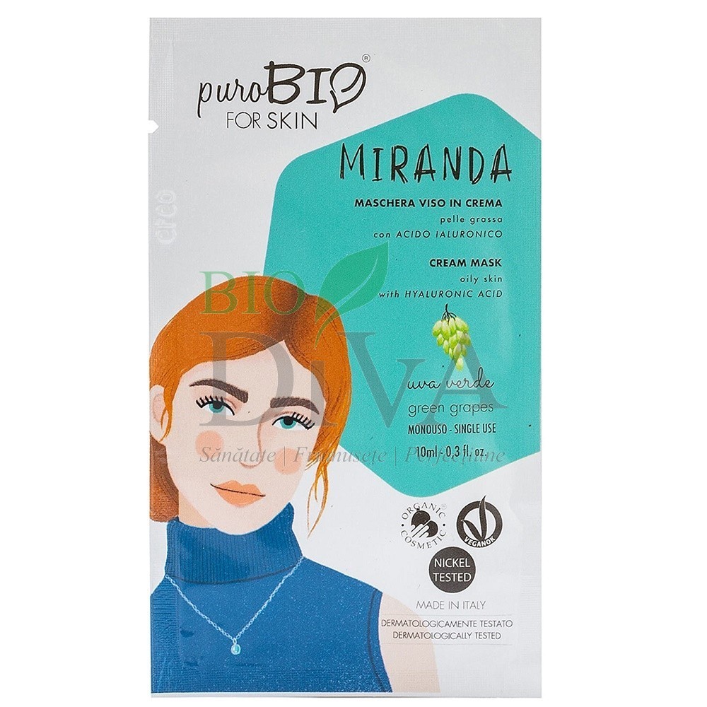 Masca cremă pentru ten gras cu struguri verzi Miranda marca PuroBio Cosmetics conține acid hialuronic și este ideală pentru ten gras, ten mixt, ten impur. Are o aromă delicată de struguri verzi. Tenul gras necesită o atenție deosebită și o îngrijire specială datorită excesului de sebum, punctelor negre și al coșurilor. Dacă te confrunți cu un ten gras, care te-a făcut să te simți incomodă în diverse ocazii, acum ai posibilitatea de a echilibra tenul cu masca cremă pentru ten gras cu acid hialuronic de la PuroBio. Produsul răsfață pielea grație texturii ușoare și catifelate. Formula este îmbogățită cu acid hialuronic cu proprietăți hidratante și apa florala de portocale cu proprietăți calmante și revigorante. Conține extracte de ceai verde, tămâie, ghimbir și lemn dulce cu proprietăți dermo-purificatoare și astringente, care fac ca această mască să fie potrivită pentru pielea grasă, mixtă, cu impurități.