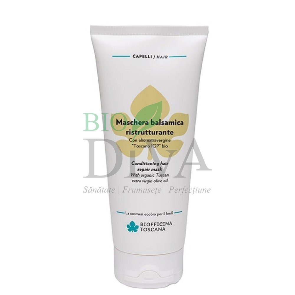 Masca pentru păr ondulat și creț Biofficina Toscana este un tratament pentru păr ondulat și creț cu ulei de măsline bio. Mixul de ulei de măsline și extractele vegetale conferă acestei măști proprietăți restructurante și face că părul să fie mai ușor de pieptănat și de aranjat. Hidratează părul, îl face mătăsos și îi conferă volum fără să îl încarce. Masca de păr restructurantă Biofficina Toscana are un parfum delicat dat de uleiurile esențiale din compoziție de salvie și mentă. Poate fi folosită și ca balsam de păr.