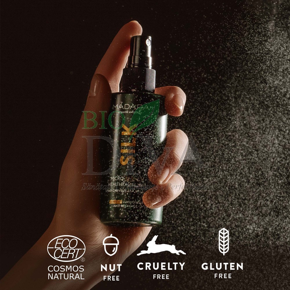 Spray-ul leave-in pentru păr Silk Micro Keratin Madara contribuie la repararea și regenerarea fibrei de păr și la evitarea vârfurilor despicate. Îmbogățit cu cheratină hidrolizată, acid lactic și extracte de alge, formula leave-in învăluie firul de păr cu un strat protector. Contribuie la restabilirea structurii părului fragil sau deteriorat, oferindu-i elasticitate, finețe și strălucire.