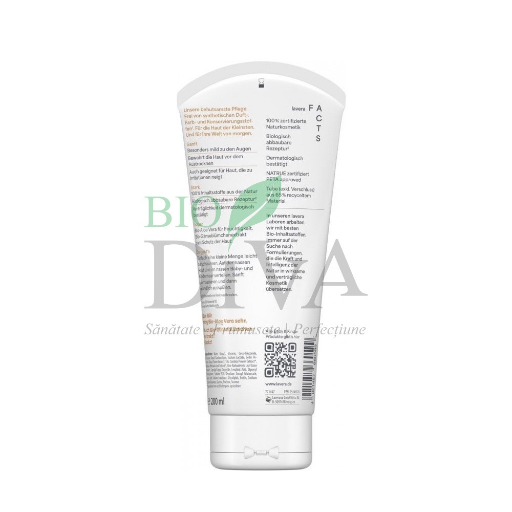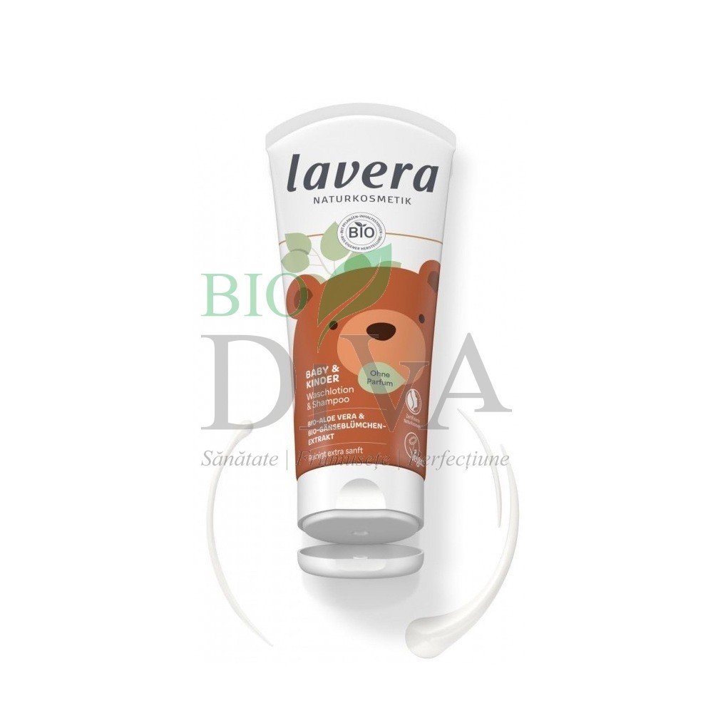 Șamponul și gelul de duș pentru copii Lavera este un produs ce conține ingrediente naturale, având rolul de a curăța eficient și blând pielea și părul celor mici. Îmbogățit cu aloe vera, acesta asigură hidratarea și calmarea pielii. Prezența uleiului organic de luminiță de seară protejează pielea sensibilă a copiilor și previne uscarea acesteia. Formula produsului acționează blând și este special creată pentru piela predispusă la alergii sau dermatite. De asemenea, produsul nu conține arome sintetice, conservanți, parfum, uleiuri esențiale, coloranți sau alergeni.