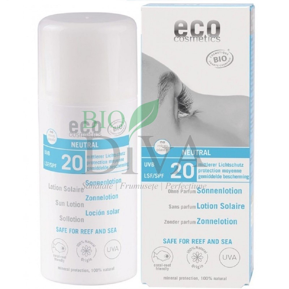 Loțiunea fluidă de protecție solară SPF 20 fără parfum Eco Cosmetics este ideală pentru pielea sensibilă, pentru ten și corp. Uleiurile organice de măsline și de cătină din compoziție îngrijesc delicat pielea și o protejează de deshidratare. Nu lasă urme albe, se întinde ușor și protejează imediat după aplicare. Nu conține oxid de zinc, nu blochează porii, poate fi folosită atât pe față, cât și pe corp, pentru adulți și copii. Flaconul airless permite o aplicare foarte facilă, nu permite contactul loțiunii cu aerul și contaminanții, menținând prospețimea produsului până la terminare. Lotiunea de protecție solară Eco Cosmetics nu conține ingrediente periculoase pentru om sau pentru organismele acvatice. Protejează de radiațiile UVA și UVB și au textura fluidă, ușor de întins pe piele.