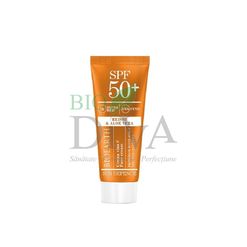Crema solară bio pentru ten SPF 50 cu ganoderma și aloe Sun Defence marca Bioearth este o cremă cu factor de protecție solară ridicat FPS50+, care îți protejează pielea împotriva radiațiilor UVA și UVB și împotriva razelor infraroșii IR. Protecție triplă pentru un ten fără arsuri solare, pete pigmentare, riduri cauzate de soare. Este formulată cu extracte de ganoderma, aloe vera și ingrediente inovatoare care combat semnele de îmbătrânire și formarea petelor pigmentare. Ideală pentru pielea deschisă și foarte deschisă la culoare care tinde să se păteze (hiperpigmentare). Ideală pentru primele expuneri la soare. Bogată în uleiuri cosmetice (floarea soarelui, migdale dulci și sâmburi de struguri) și extracte vegetale, crema solară SPF50 Sun Defence menține pielea hidratată, previne deshidratarea și uscarea, îmbunătățind vizibil aspectul tenului. Ingrediente active: ganoderma, extract de ceai verde bio, aloe vera bio, ulei de floarea soarelui bio, vitamina E, bisabolol și extract de imortele bio.