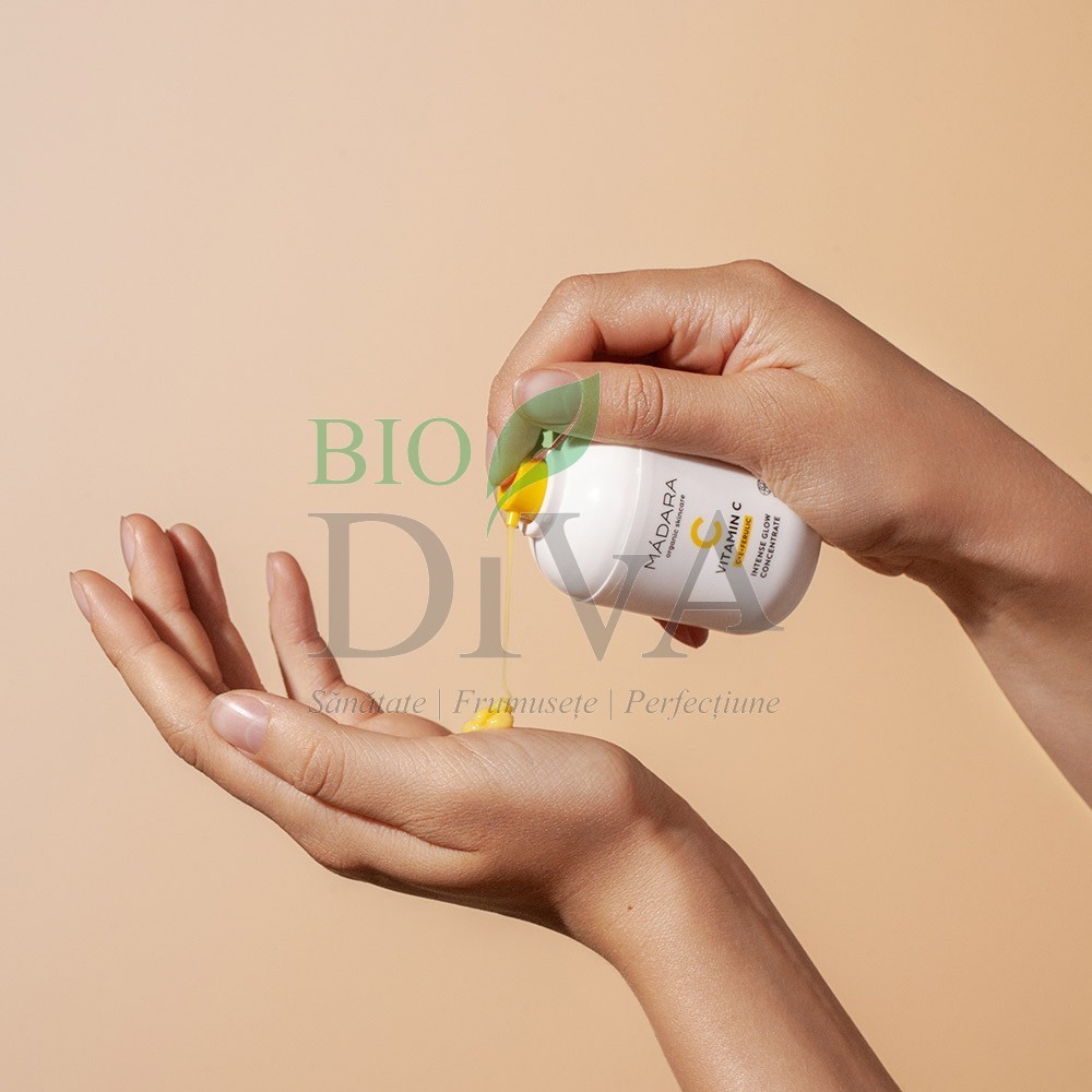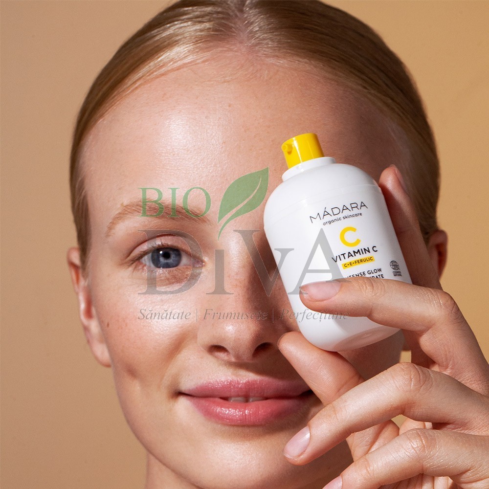 Serul concentrat Intense Glow Concentrate vitamin C Madara oferă pielii o porție de super strălucire cu această esență iluminatoare, bazată pe un amestec complementar de acid ferulic și vitaminele C + E. Datorită proprietăților sale antioxidante puternice, acidul ferulic ajută la stimularea fermității pielii, crescându-i rezistența împotriva efectului negativ al radicalilor liberi, în timp ce vitaminele C + E acționează pentru a îmbunătăți tonusul pielii și a-i reda strălucirea sănătoasă. Țintește daunele provocate de soare și de mediu, contribuind la prevenirea semnelor premature de îmbătrânire, linii fine, hiper-pigmentare și pierderea elasticității.