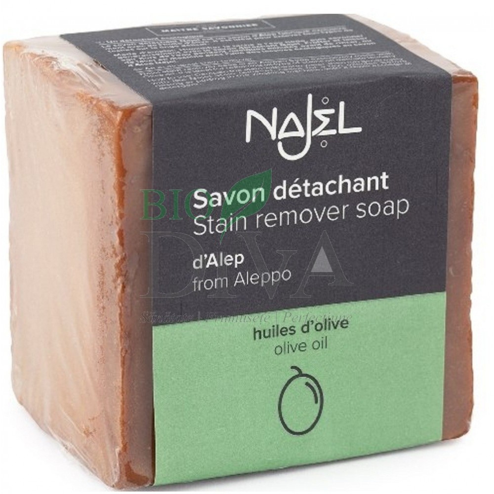 Sapun de Alep din gama Najel este dedicat indepartarii petelor de orice tip sau pentru spalarea animalelor de companie, eficient si natural. Sapunul de Alep este un sapun natural recunoscut pentru proprietatea sa de degresare. Este realizat din ulei de masline si este un produs care poate fi utlizat in siguranta pentru igiena animalelor.