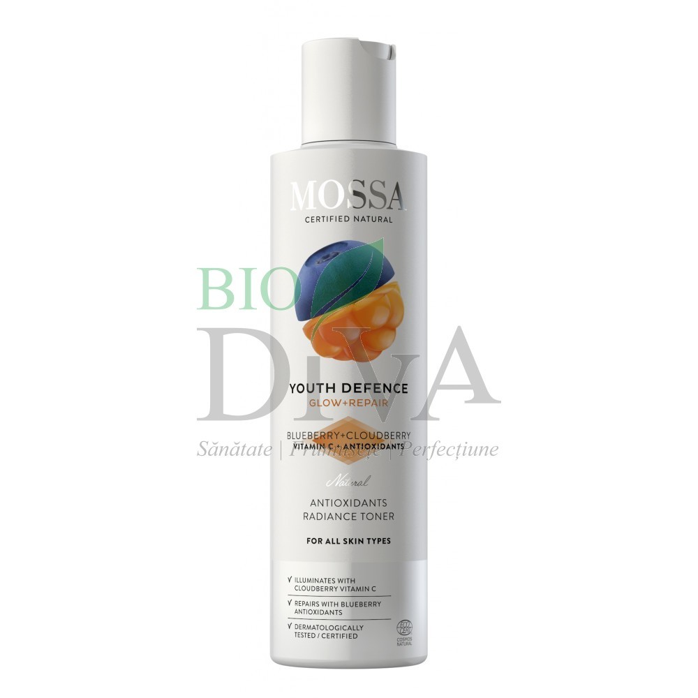 Loțiunea tonică antioxidant pentru toate tipurile de ten Youth Defence marca Mossa este ideal pentru un ten cu aspect radios, revigorează tenul și oferă un plus de vitalitate și strălucire. Substanțele cu efect antioxidant extrase din coacăze ajută la protejarea pielii față de efectele negative ale acțiunii radicalilor liberi. Vitaminele provenind din fructele de mur pitic contribuie la atingerea unui aspect radios, vital, întinerit. Furnizează cele mai spectaculoase rezultate dintre toate fructele de pădure, fructe (în general) și legumele analizate. Antioxidanții antociani stabilizează fibrele de colagen și stimulează biosinteza colagenului, încetinind procesul de îmbătrânire. Conține variate tipuri de vitamina E (alfa, beta, gamma tocoferoli și alfa, beta și gamma tocotrienoli), precum și doze ridicate din vitaminele A, B și C. Concentrația înaltă de vitamina C – de 4 ori mai ridicată decât într-o portocală – stimulează biosinteza colagenului și reînnoirea epidermei. Concentrația ridicată de antioxidanți ajută lupta împotriva factorilor de mediu dăunători și a stresului oxidativ.