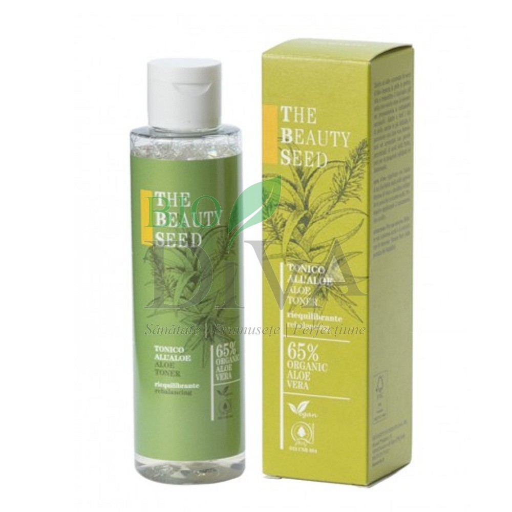 Loțiunea tonică cu 65% aloe Bioearth îndepărtează resturile de machiaj și impuritățile, reechilibrează pH-ul pielii și restabilește bariera de protecție a tenului. Ideală pentru toate tipurile de ten, inclusiv pentru tenul sensibil. Conține aloe vera și acizi din fructe.