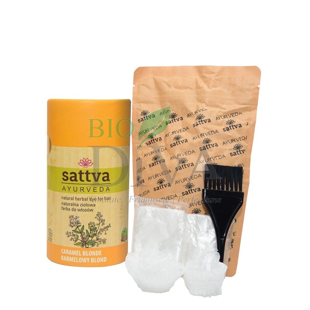 Vopseaua de păr Blond Caramel Sattva Ayurveda este o vopsea henna 100% naturală, care colorează blond caramel părul alb, blond deschis. Nuanțz de blond care se obține depinde de nuanță/nuanțele pe care se aplică. Vopseaua Blond Caramel conține plante care colorează părul (henna, cassia, mușețel, indigo), plante ayurvedice care revitalizează părul (amla și bhringraj) și purifică scalpul (neem).