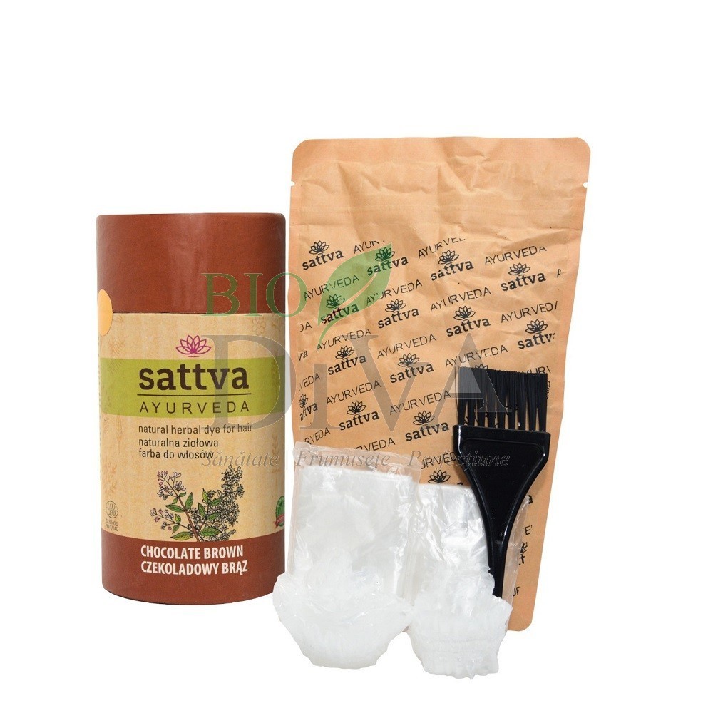 Vopseaua Ciocolatiu Deschis Sattva Ayurveda este o vopsea henna 100% naturală, care colorează părul în nuanțe de șaten ciocolatiu intens, cu subtonuri calde, în funcție de nuanță/nuanțele pe care se aplică. Conține plante care colorează părul (henna și indigo), plante ayurvedice care revitalizează părul (amla, bhringraj) și neem care purifică scalpul (neem). 100% naturală, conține doar plante.