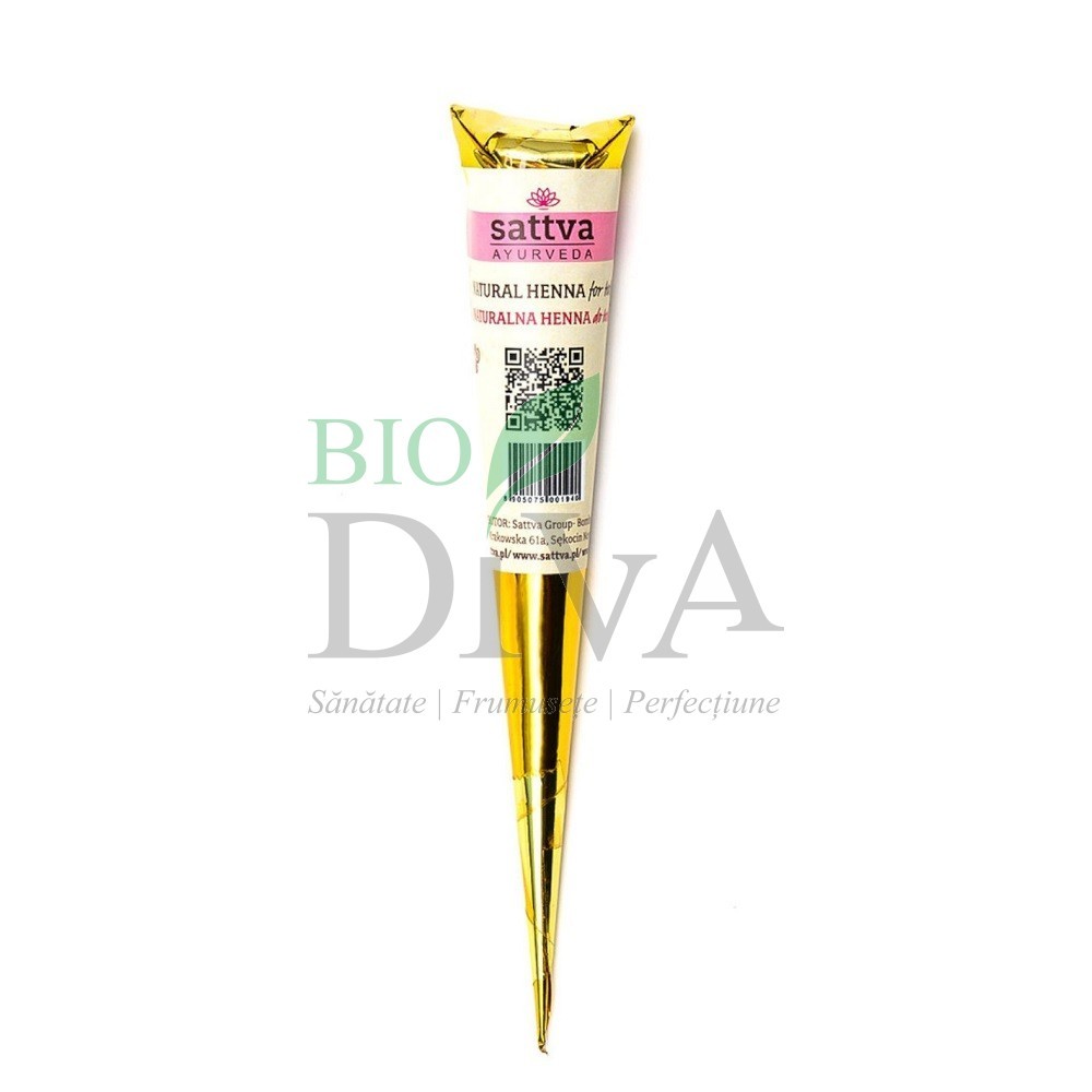Henna pentru tatuaje temporare Henna Tattoo Sattva Ayurveda conține uleiuri esențiale și se folosește pentru realizarea desenelor pe piele (tatuaje temporare). Tatuajul temporar va fi maroniu roșiatic în ziua realizării și un maroniu mai închis în zilele următoare (henna este o plantă care pigmentează pielea natural prin oxidare). Tatuajul rămâne pe piele 7-14 zile, în funcție de zona și de modalitatea de îngrijire a pielii tatuate. Tatuajul obținut cu henna ține mai mult timp pe piele dacă se evită contactul cu apa a zonei tatuate în următoarele ore de la aplicare și în general. â